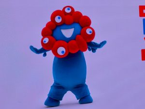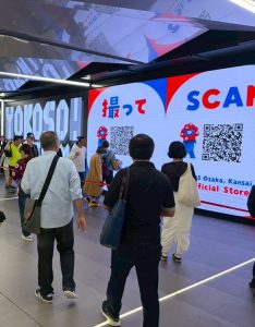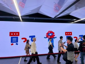 夢洲駅では、巨大スクリーンでミャクミャクがお出迎え。テンション爆上がりのおじさん達。