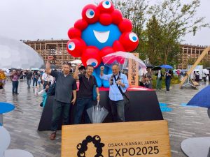 でも、雨で悪いことだけではない。会場のゲートを潜ってすぐ、ミャクミャク像に以外と人がいない。チャンス!カップルと小さなお子さんを連れた夫婦に挟まれ、おじさん達は写真撮影順番待ち。そして、「おじさんぽ、スタート!!おーっ!」でパシャリ。