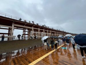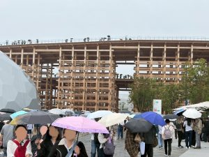 次に大屋根リングを目指す。事前情報では、大屋根リングに上がるにも並ばなければならないとのことだったが、ここでも雨の恩恵。雨の中、大屋根リングに上がる人は少なく、楽々2つ目のミッションもクリア。