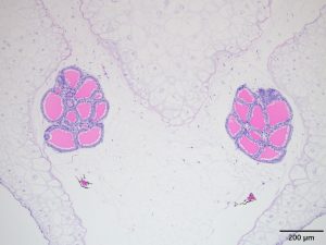 弊社ではAMA試験に対応した組織標本として、アフリカツメガエルのオタマジャクシの甲状腺を複数貼り付けたスライドグラスを作製することが可能になりました。また、複数の切片を1つのスライドグラスに張り付ける操作は、AMA試験以外の作製でも可能です。そちらについてもお気軽にお問い合わせください。
