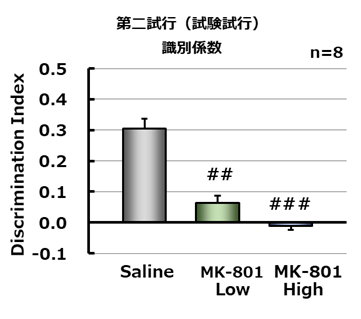 訓練施行において、MK-801は異なる場所(cornerとcenter)に置いた物体に対する探索時間に影響を与えなかった(左図)。試験試行においてMK-801は用量依存的かつ有意に識別係数を低下させた。(右図)。##; p<0.01, ###; p<0.001 vs saline (Dunnett’s test)