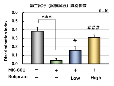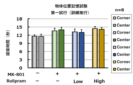 訓練施行において、被験物質の処置は異なる場所(cornerとcenter)に置いた物体に対する探索時間に影響を与えなかった(左図)。試験試行においてMK-801処置により有意な識別係数の低下が認められた。MK-801による物体位置記憶の障害はrolipramによって用量依存的かつ有意に改善された。(右図)。***; p<0.001 vs saline (Student’s t-test), #; p<0.05, ###; p<0.001 vs MK-801 (Dunnett’s test)