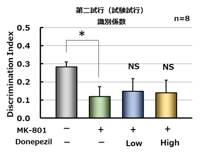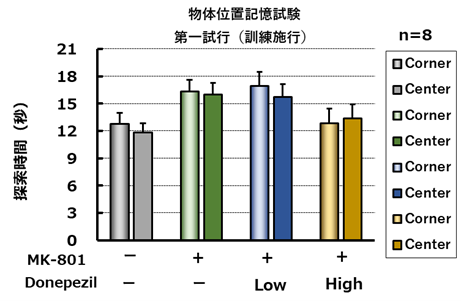 訓練施行において、被験物質の処置は異なる場所(cornerとcenter)に置いた物体に対する探索時間に影響を与えなかった(左図)。試験試行においてMK-801処置により有意な識別係数の低下が認められた。一方、MK-801による物体位置記憶の障害はdonepezilによって改善しなかった。(右図)。*; p<0.05 vs saline (Student’s t-test), NS; Not Significant vs MK-801 (Dunnett’s test)