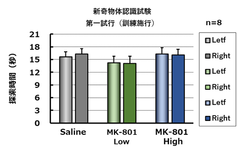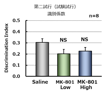 訓練施行において、MK-801は2つの物体に対する探索時間に影響を与えなかった(左図)。試験試行においてMK-801は識別係数を減少させる傾向を示したが、用量依存性は認められず、また、溶媒処置群と比較して有意差も認められなかった(右図)。NS; Not Significant vs saline (Dunnett’s test)