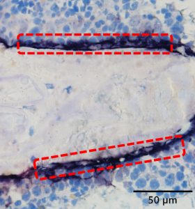 非脱灰凍結薄切切片におけるALP(Alcaline Phpsphatase;アルカリ性フォスファターゼ)染色・TRAP(Tartrate-Resident Acid Phosphatase;酒石酸耐性酸性フォスファターゼ)染色についてご紹介いたします。